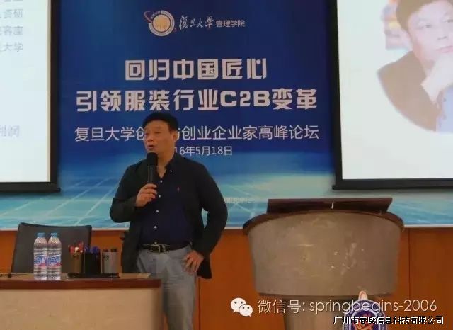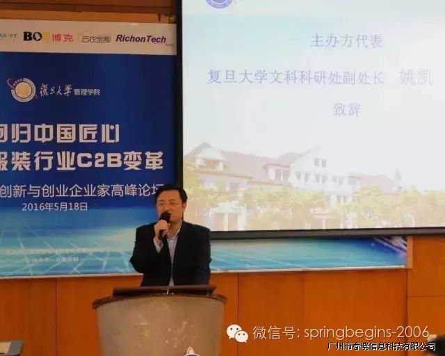 5月18日下午13:00,万众期待的“引领服装行业C2B变革,创新与创业企业家高峰论坛”在复旦大学管理学院如期召开并于下午17:30完美落幕,本次论坛由复旦大学管理学院主办、广州威廉体育信息科技有限公司协助举办,会场内座无虚席,200余人到场参会。论坛邀请了多位资深学者、成功企业家等重磅嘉宾纯干货主题演讲,受到广泛好评,会议进行中掌声持续响起。