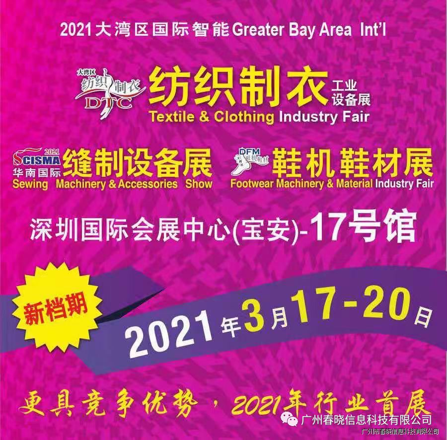 欢迎参观2021大湾区国际智能纺织制衣工业设备展DTC、华南国际缝制设备展SCISMA??威廉体育将于3月17-20日在深圳国际会展中心(宝安新馆)举行,展览规模5万平方米,逾450家知名企业同台亮相,向业界展现当今世界纺织制衣制鞋最新智能技术及设备,响应国家双循环号召,与大家共同迎接市场复苏旺季。